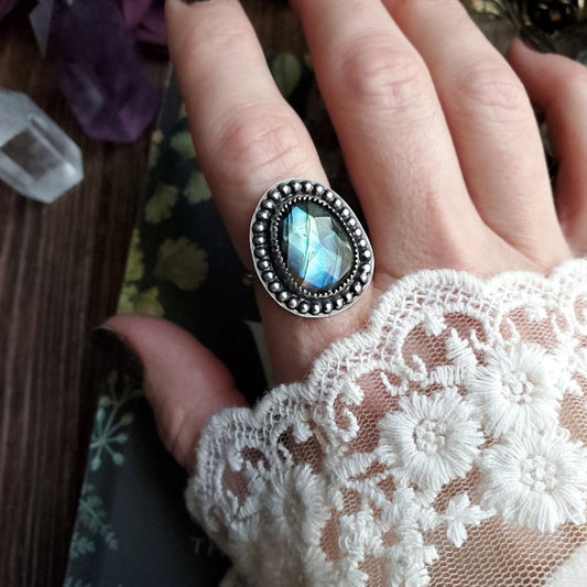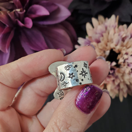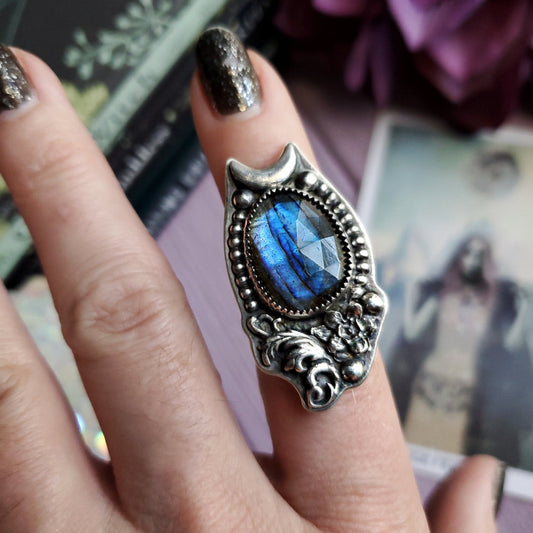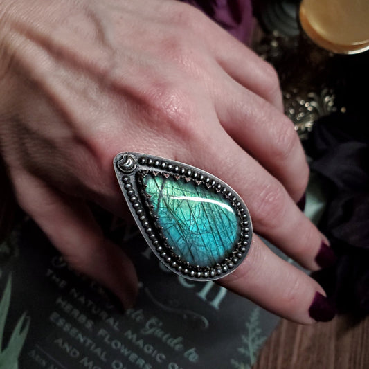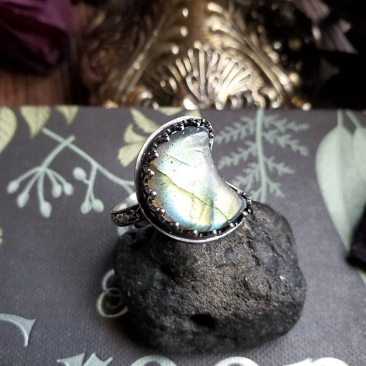 Labradorite Moon Stamped Band Ring - Sterling Silver